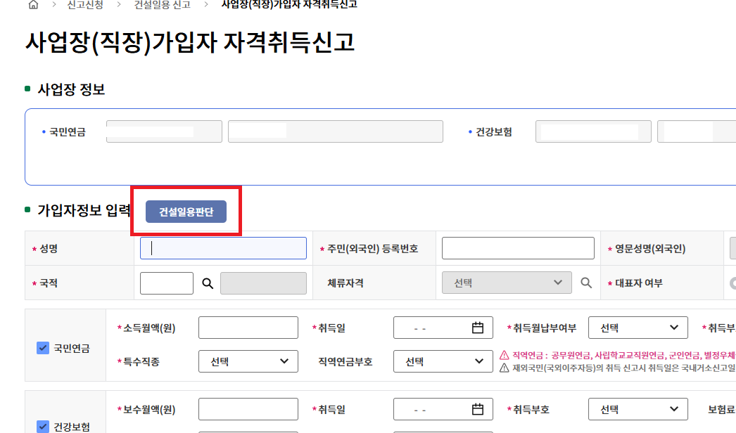 4. 근무기간 선택하여 각 현장별 일수 넣고 "가입여부 확인"
