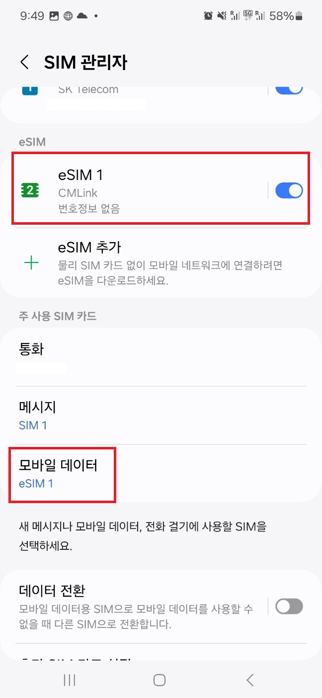 4. SIM관리자에 와서 eSIM1 확인, 모바일데이터를 eSUM1 변경.